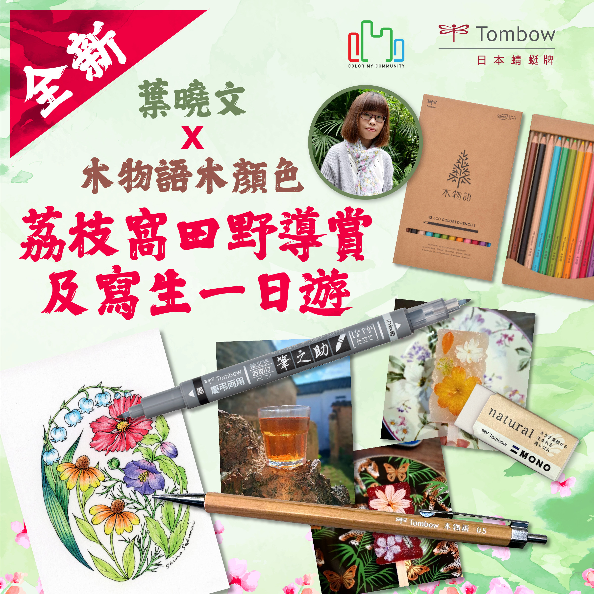 🎁 工作坊費用包括來回船票、荔枝窩農場自家製冬瓜檸檬特飲及花花雪條、繪畫工具和畫紙等,並獲贈三款 “Green Tombow”產品,包括:新版「木物語」木顏色12色裝、「木物語」鉛芯筆、MONO Natural擦膠,以及 筆之助書法筆(雙頭)、Tombow日本蜻蜓牌 精美紀念品,總值超過HK$250! 🎁